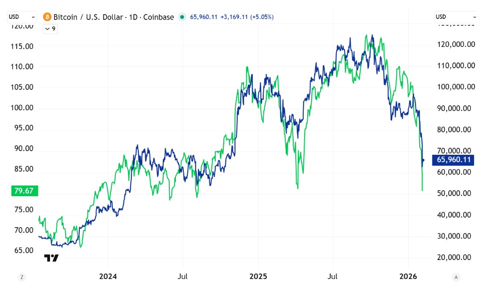 Y acá viene algo interesante: las criptomonedas están mostrando una correlación altísima con las acciones de software. Bitcoin se desplomó por debajo de los 63.000 dólares esta semana, acumulando una caída de casi 50% desde su pico de octubre. Es la peor caída desde el colapso de FTX en 2022. Ethereum, Solana y XRP cayeron todavía más.