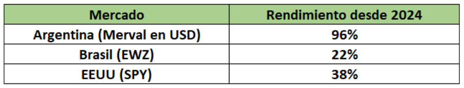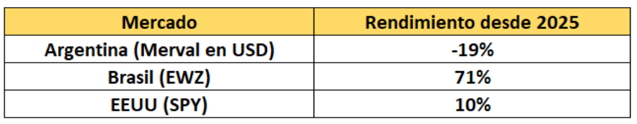 En ese sentido, Argentina empieza a ofrecer algo que hoy escasea en otros mercados: asimetría. En un mundo donde EEUU está caro y con más incertidumbre, y donde Brasil ya tuvo una buena suba, Argentina aparece como una historia con más potencial relativo, siempre con riesgo, pero también con un upside que en otros lados ya no es tan evidente.