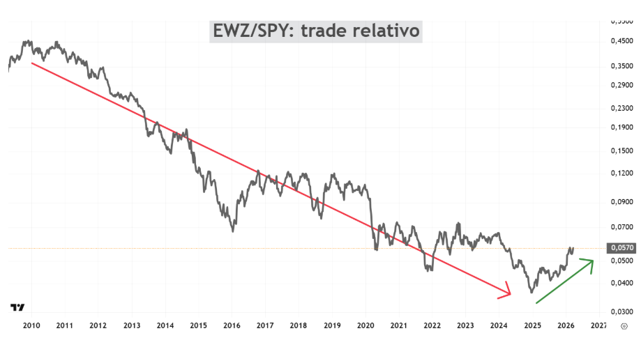 Si miramos este ratio EWZ/SPY, lo que vemos es bastante claro: durante más de una década, EEUU le ganó sistemáticamente a Brasil. Pero eso empezó a cambiar en 2025.