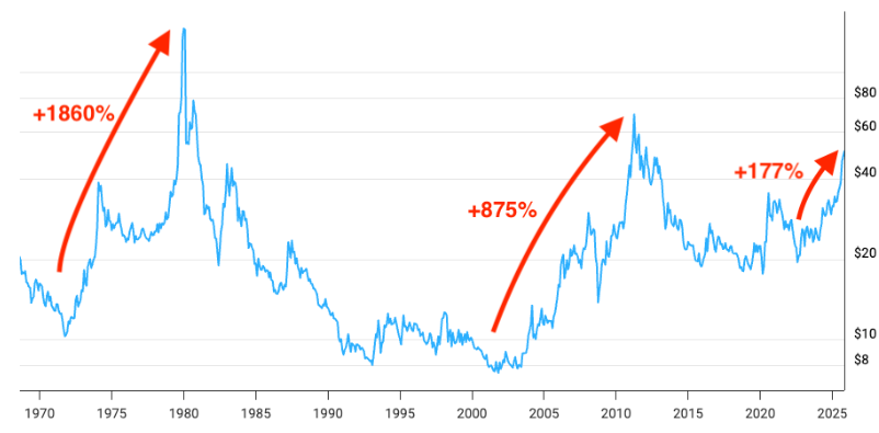Si asumimos que este ciclo podría significar una suba del 1000%, el precio de la plata debería subir hasta $215 por onza (el último precio es $46).