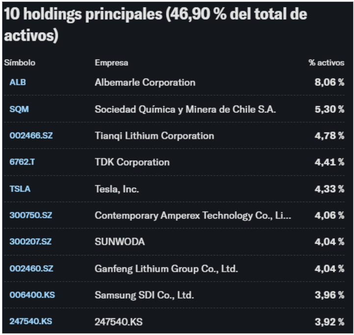Un buen ejemplo es el LIT (Global X Lithium & Battery Tech ETF). En teoría, este fondo invierte en “toda la industria del litio”. ¿Es así? Veamos: