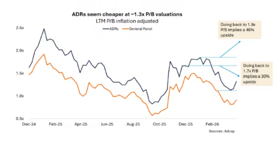 Los ADRs bancarios están operando en torno a 1,3 veces valor libros, niveles bajos para el contexto actual. Si uno mira el histórico reciente, volver a niveles de 1,7/1,9 implicaría upside interesante en torno al 30%.