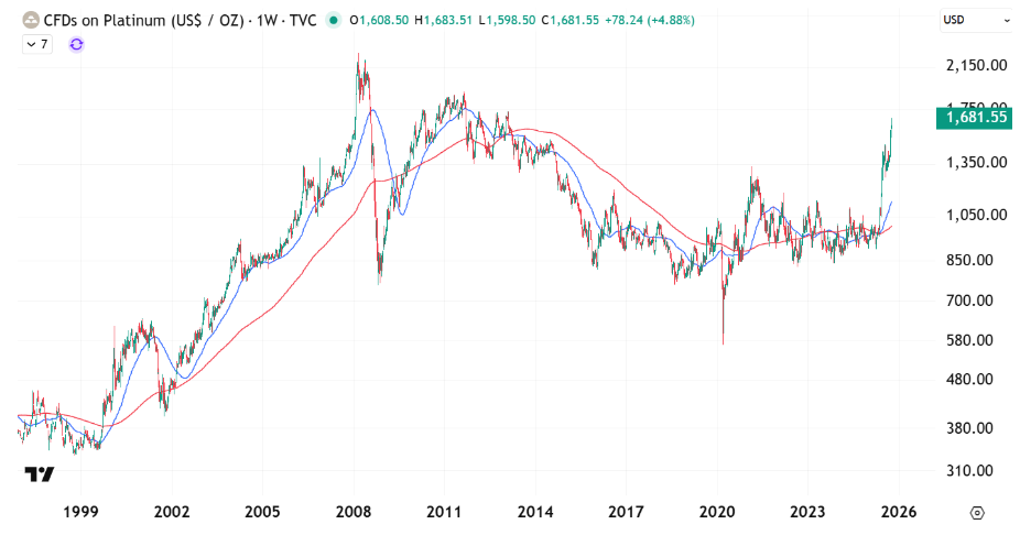 Si bien el platino se disparó más de 20% en el último mes, todavía está más de 25% abajo de su máximo histórico.