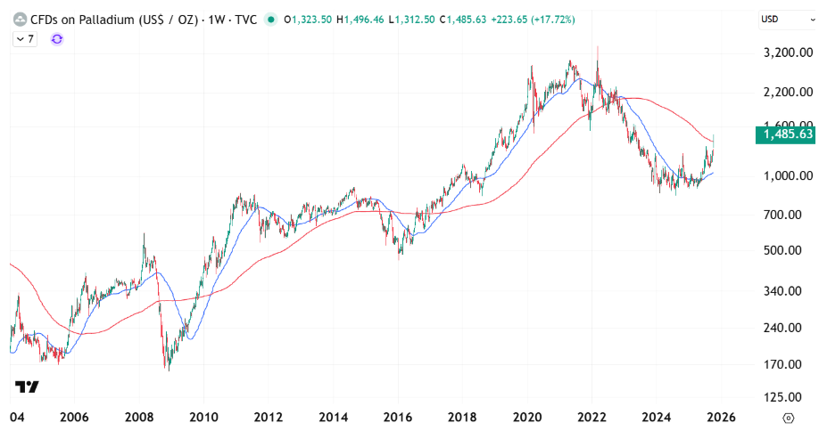Otro metal precioso que comenzó a moverse y tiene un enorme potencial de suba. Está más de 55% debajo de su máximo histórico, alcanzado en 2022 cuando estalló la guerra entre Rusia y Ucrania (Rusia es el principal productor mundial con casi el 40%).