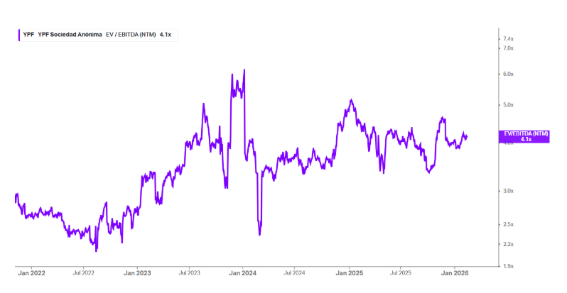 Después viene la pata de la valuación. Cuando decimos que YPF cotiza cerca de 4x EV/EBITDA forward, lo que estamos midiendo es cuánto paga el mercado por toda la compañía en relación con la caja operativa que genera.
