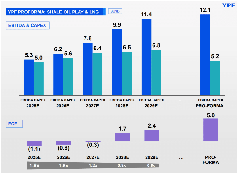YPF está invirtiendo hoy para ganar caja (FCF – free cash flow) en unos años. En los primeros períodos el flujo de caja libre (barras violetas) es negativo porque el Capex (barras verdes) es muy alto, sobre todo por Vaca Muerta y el proyecto de GNL. Es decir, la empresa está gastando más de lo que genera operativamente, pero con el objetivo de aumentar fuertemente el EBITDA (barras azules) en el futuro. A medida que pasan los años, el EBITDA crece, el Capex se estabiliza y ahí aparece el flujo de caja positivo.