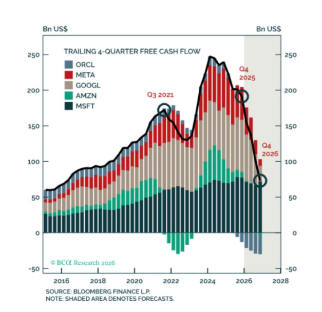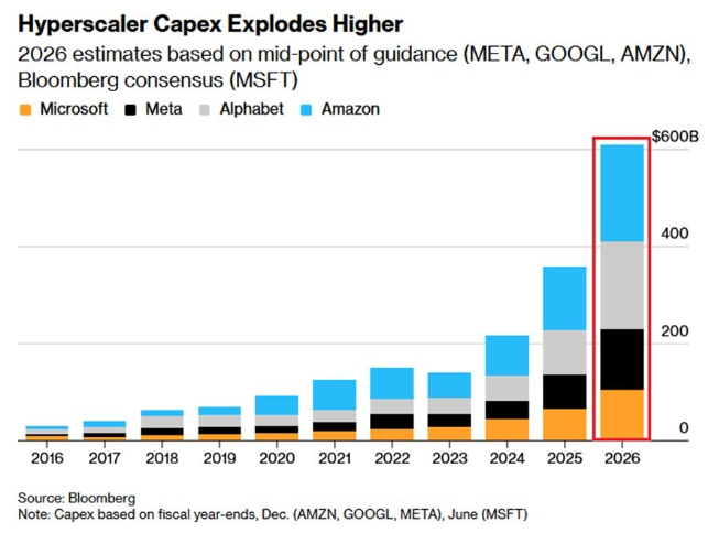 Se espera que el CapEx (Gastos de Capital o “Capital Expenditure”) combinado de Amazon ($AMZN), Alphabet ($GOOGL), Meta ($META) y Microsoft ($MSFT), aumente un 70 % interanual, hasta un récord de USD 610B en 2026.
