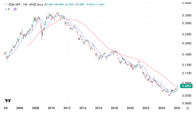 Para terminar, sugiero mirar EEM (emerging markets) relativo a SPY . Elegí EEM porque tiene historia desde 2003 y muestra muy bien el cambio de ciclo posterior a 2008.