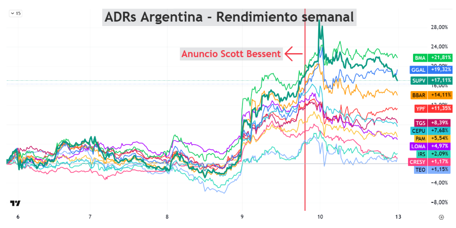 Mientras tanto, el dato de la semana fue clarísimo: los activos argentinos tuvieron una de las mejores semanas de los últimos años.