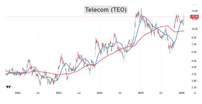 El gráfico acompaña y dice bastante más de lo que parece a simple vista. Telecom viene en una tendencia alcista de largo plazo muy clara: desde los mínimos de 2023 acumula una suba superior al 250%. El precio se mantiene por encima de la media móvil de 200 ruedas, que es la referencia clásica para definir tendencia alcista de largo plazo.