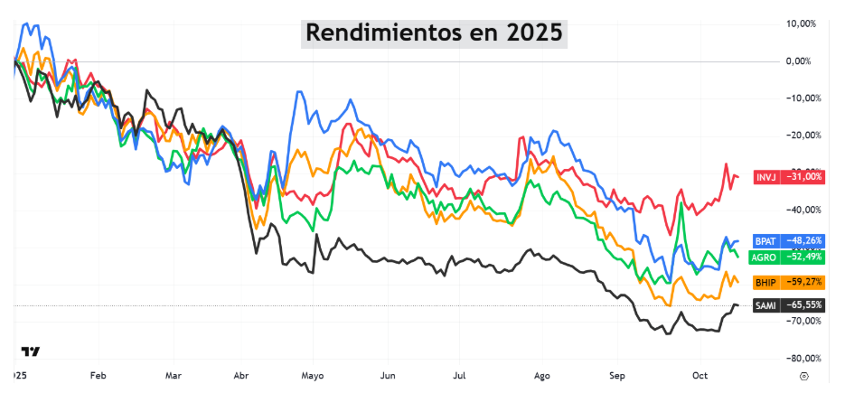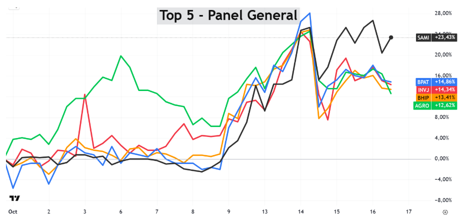 En ese escenario, cinco acciones del Panel General se despegaron del resto y lideraron en octubre: SAMI, BPAT, AGRO, BHIP e INVJ.
