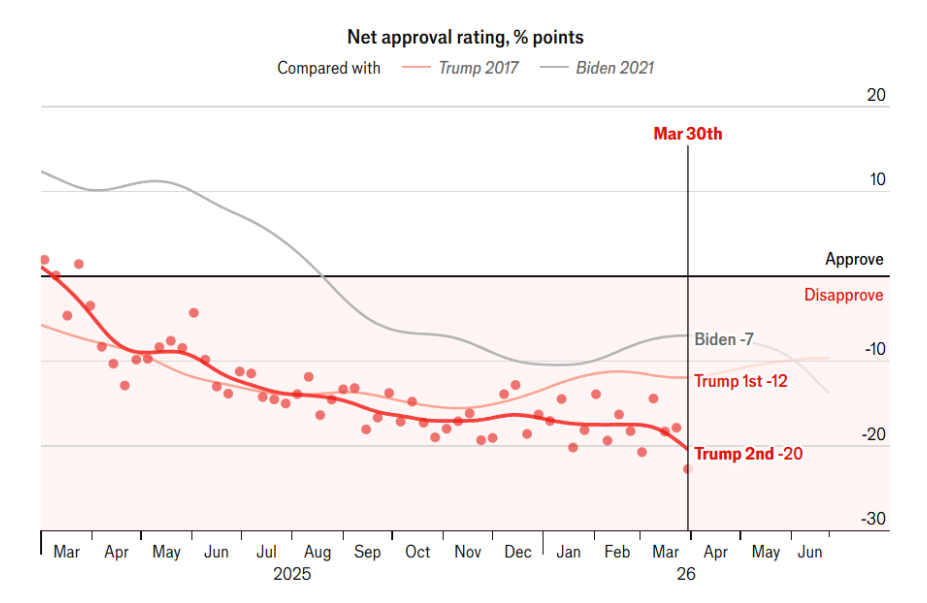 Su desaprobación llegó al 57% – la más alta de toda su carrera política, sumando ambos mandatos. Creo que es interesante ver este gráfico de “The Economist”, donde se ve claramente como se empezó a acelerar la desaprobación neta (aprobación menos desaprobación):