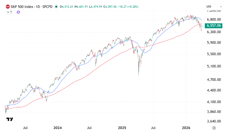El índice ya está por debajo de ambas – una configuración que técnicamente es bajista. Pero el cruce de la media de 50 por debajo de la de 200 (lo que se conoce como “death cross”) todavía no se confirmó.